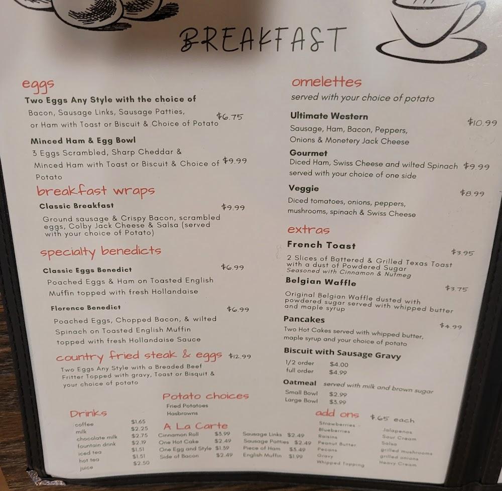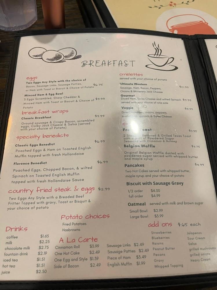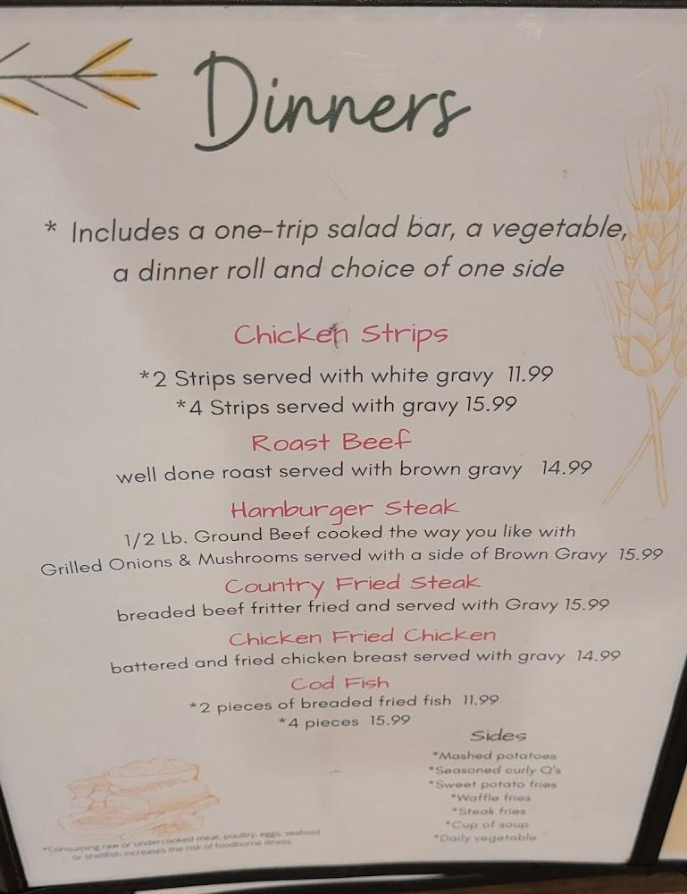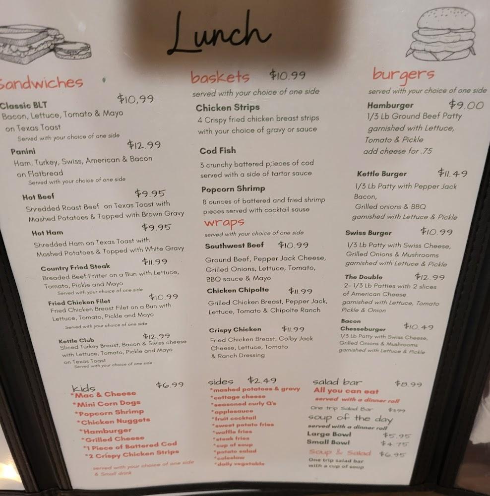 The Copper Kettle menu reflects classic American cuisine. Breakfast shines with options like omelets and hearty pancakes. For lunch and dinner, specialty items include burgers, chicken strips, and the beloved chicken and noodles.